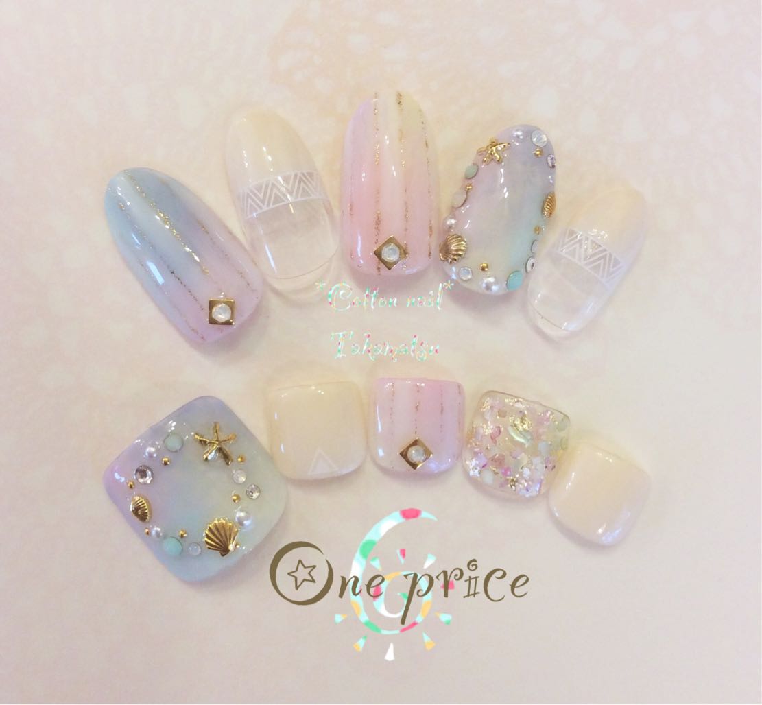 フットネイルの薬指にはシェルをうめつくし