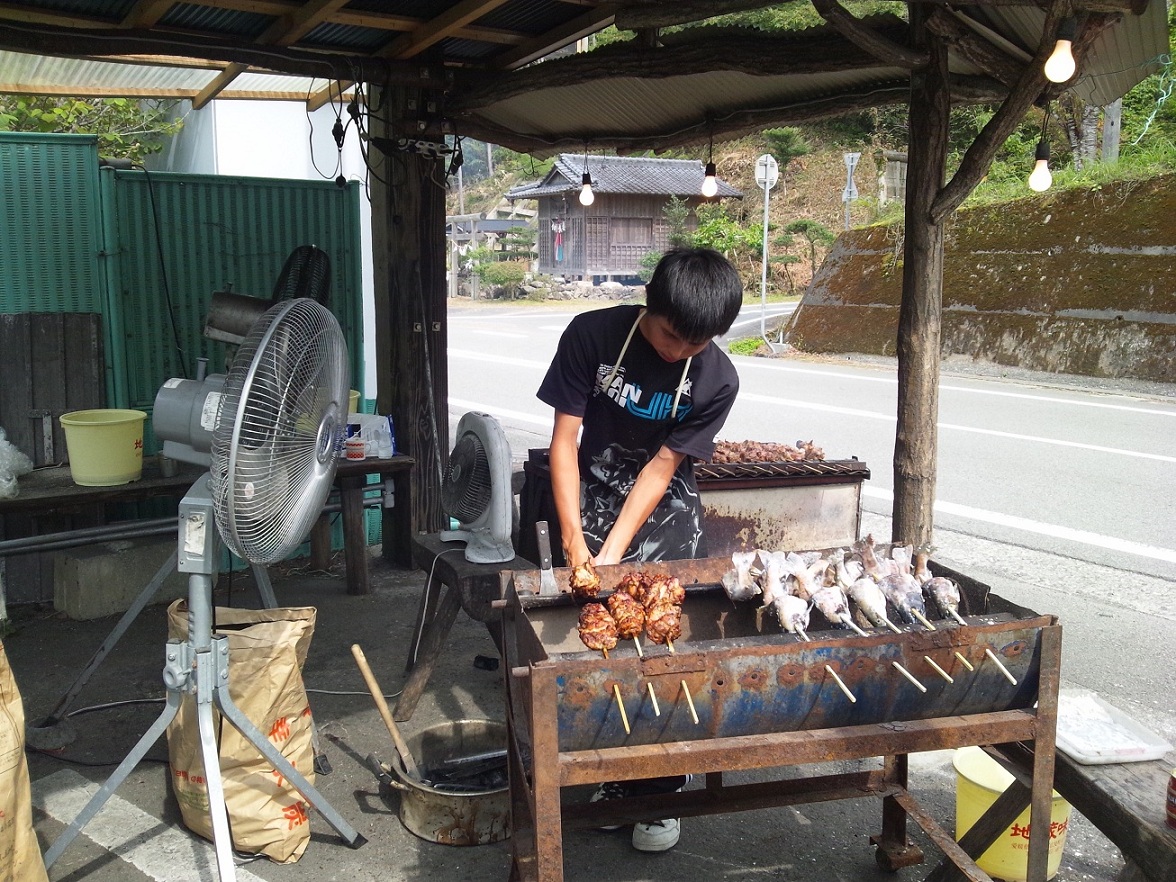 山賊の息子らしき少年が店先でせっせと焼いており、