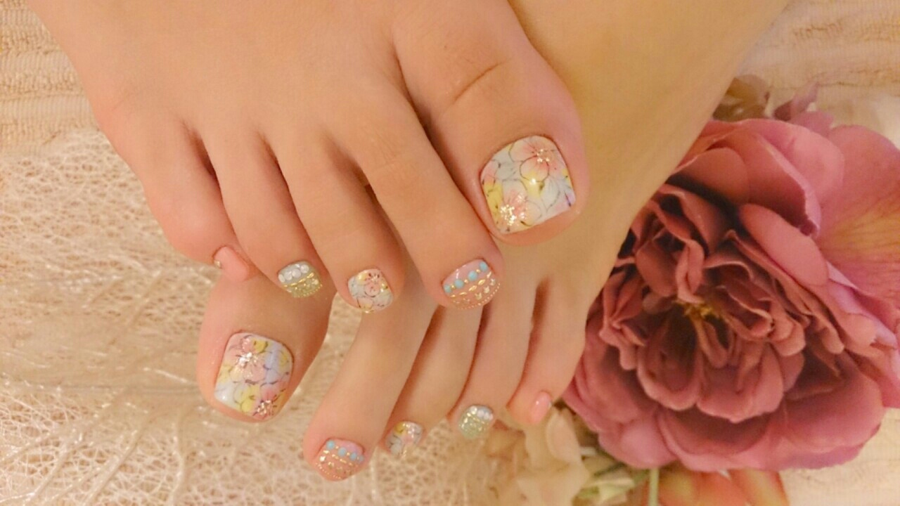 Onepricenailのお花にビジューボーダーをMIXさせて。