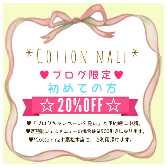 香川県 高松市 にある 癒しの ネイルサロン *Cotton nail* (コットンネイル)高松本店のスタッフBlog。ネイル・ジェルネイル・ネイルケア・フットケア・フットジェル・どんなメニューもおまかせください^^