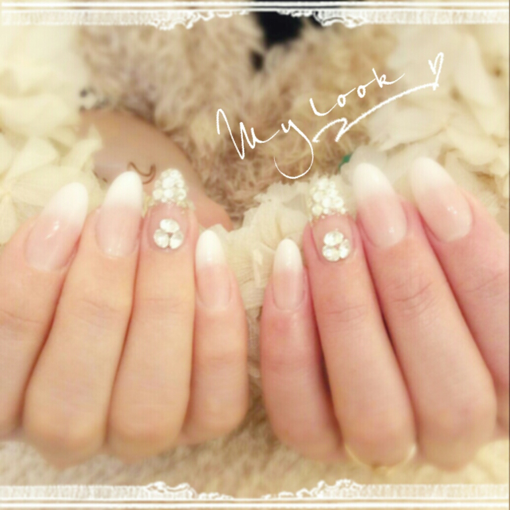 白のグラデに、1本ずつキラキラビジューの爪が!(人´∀`)。:*・゜